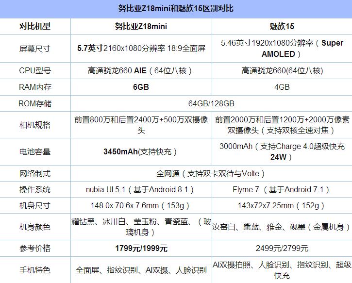 老规矩,首先来看看努比亚Z18mini和魅族15价格、硬件配置上的区别,看看差价700元起,在硬件上都有哪些不同,如下所示。