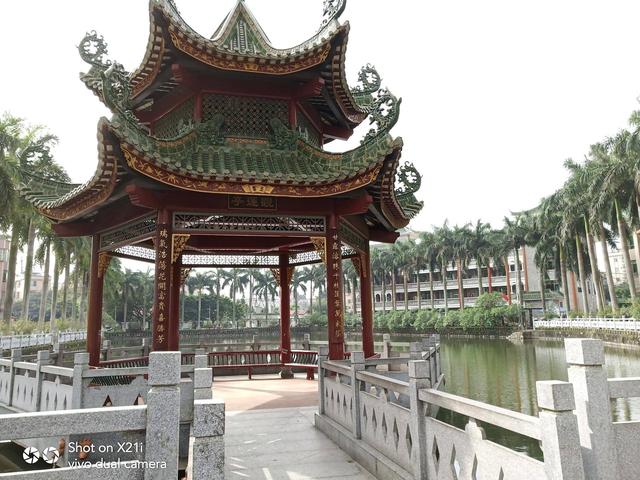 这一张同样逆光,整张照片色彩和明亮度均为上佳。图中可见,近处小亭子的砖瓦、柱子纹理清晰,远处排排椰子树叶、小池水面涟漪,细节丰富。
