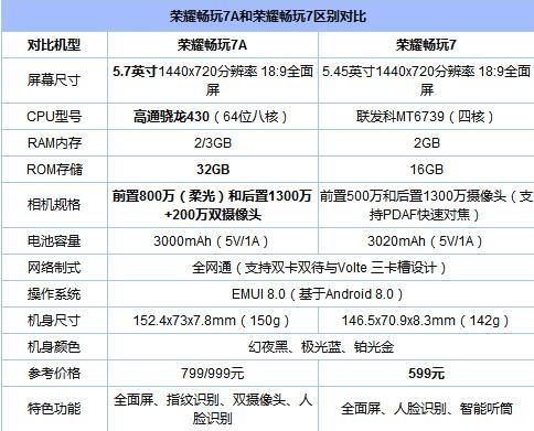 老规矩,首先来看看荣耀畅玩7和7A在价格、配置参数方面的区别,对比如下所示。