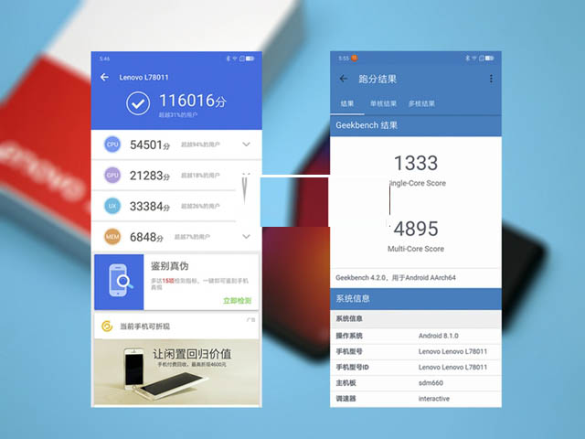 从新版安兔兔评测V7测试来看,联想Z5安兔兔跑分超过了11万分,相比7万分左右的骁龙625千元机,跑分高了近5万分。而Geekbench单核为1331分,多核为4895分,性能已经达到中等偏上水平,性能上无短板。