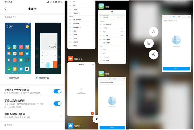 MIUI 10的全面屏手势为上滑主界面,上滑短暂停顿为最近任务界面,左滑/右滑为返回。值得说一下的是,MIUI 10的返回键手势十分便捷,用上以后再用其它手机会习惯性往左或右滑动,简直有毒。