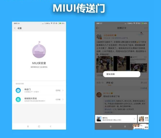 MIUI9最重要的一大创新功能则是“传送门”。可以通过对文字内容的智能分析,提取有效信息,不需离开当前的应用就可以显示需要的信息。而如果想要深度了解,甚至可以直接进入APP的相关内容,非常方便,提升了再次处理的效率。