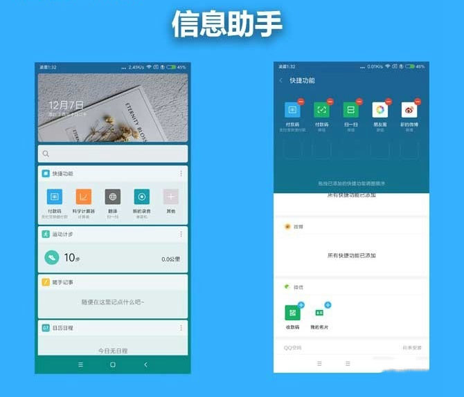 在MIUI9中,将负一屏的“智能助理”改成了如今的 “信息助手”,最大程度的进行“整合”这个动作,做成了一个属于用户自己的信息聚合负一屏。将在不同应用中常用的功能集合到负一屏的卡片中,使得用户在需要这些功能时在信息助手中能快速查看,一步到位。在负一屏中,新增的包括快捷功能、快递信息、支出计算、我的收藏、股票行情等各种功能。并且在顶部的五个常驻功能快捷入口中,提供了诸如“微信付款码”、“扫一扫”等日常超高频使用的功能,一步直达,非常便捷。