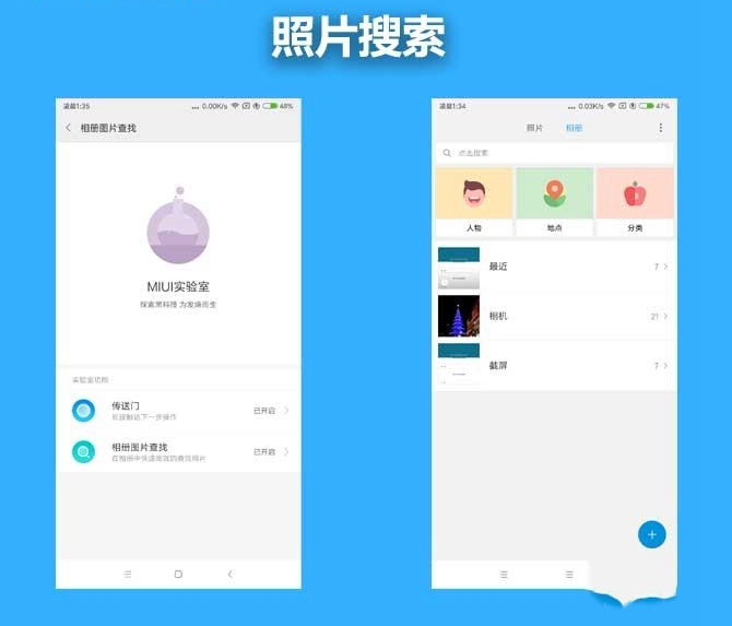 另外,此次MIUI9还加入的查找照片功能,就是基于先进的机器学习和图像识别技术,这就是所谓“人工智能”的一部分。而在MIUI9的照片查找功能中,用户可以查找到人物、证件、截图等各种类型的照片。(需要通过MIUI实验室开启)