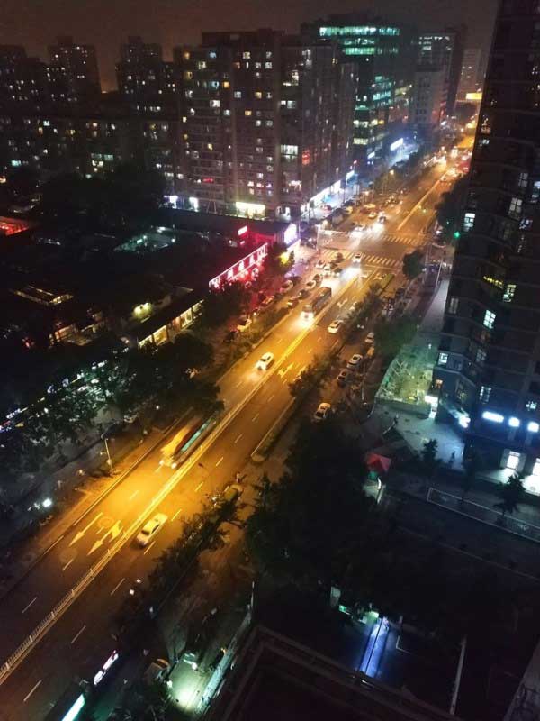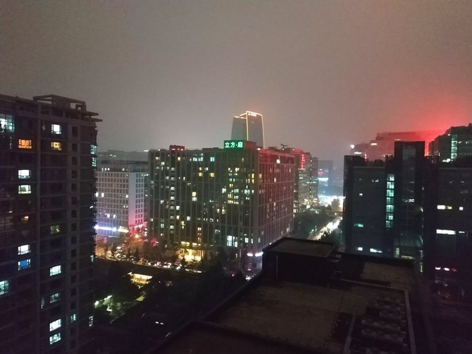 而在夜晚的拍摄条件下,AI场景相机在拍摄起始就自动完成了夜晚的场景识别,成像质量不错,部分细节还原的很好,远处的发光字也都基本清晰,没有出现散光的效果。不过,夜晚拍摄出的天空噪点比较明显,对运动的物体把握的也不是很好。