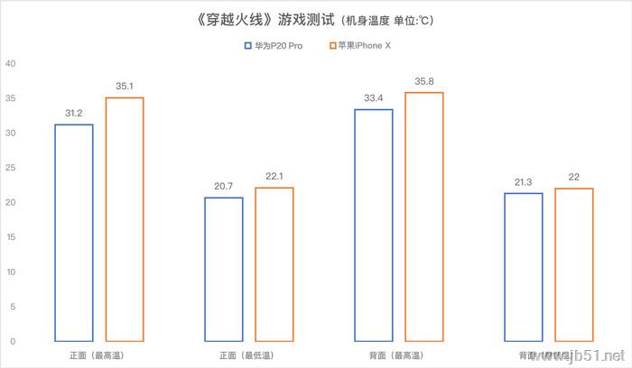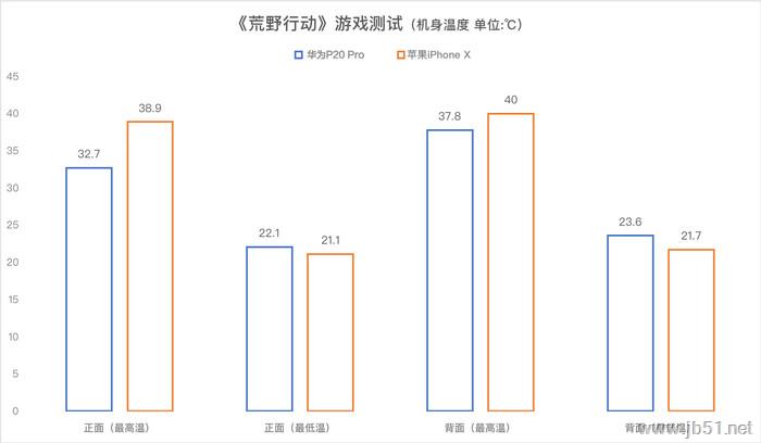 以两个更耗资源的游戏为例,每个游戏均进行30分钟测试,结果是iPhone X机身最高温均高于华为P20 Pro,最高为《荒野行动》,达到40℃高温,很可能也是后期造成掉帧的原因。