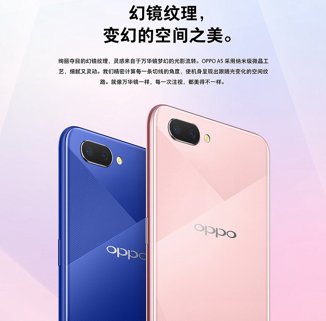 背面方面,作为一款OPPO旗下的低价千元机,A5在机身材质上并非主流的玻璃或金属材质,而是塑料材质机身。不过在塑料后壳上加入了一些特殊工艺的喷砂,营造出绚丽夺目的幻境纹理,有一种类似玻璃后壳视觉效果。