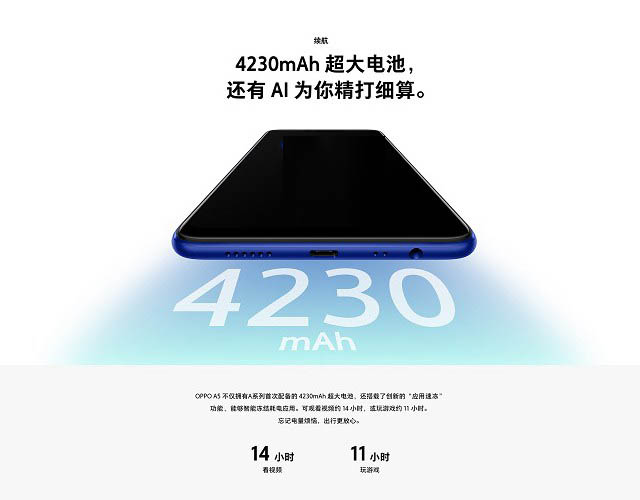 OPPO A5在硬件上主要是细节优势,比如较大的4+64GB内存组合以及内置4230mAh大容量电池了,结合低功耗的骁龙450处理器,分辨率不高的720P屏幕,续航上会有不错的表现。但需要注意的是,这款手机并不支持快充,大容量电池充电速度相对比较慢。