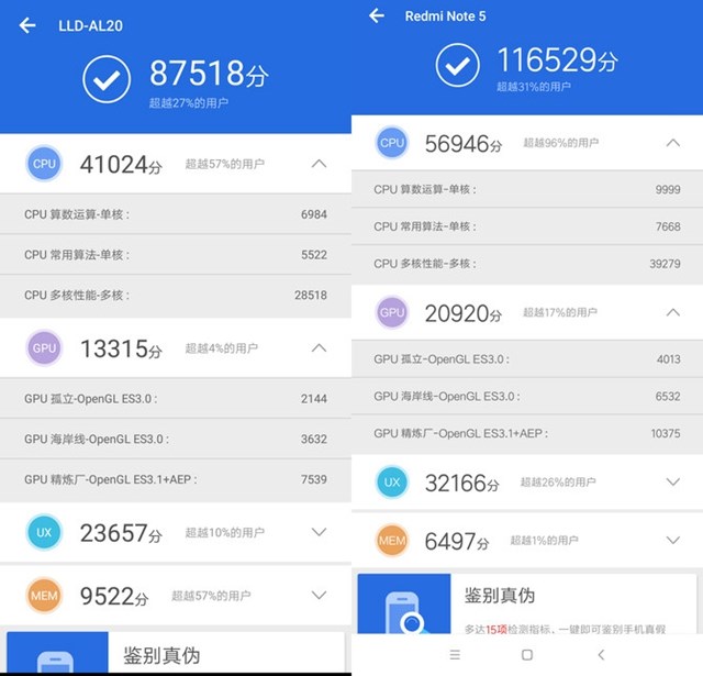 ▲安兔兔跑分(左:荣耀9i;右:红米note5)