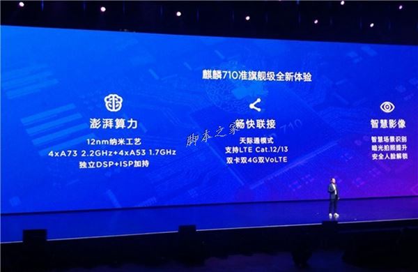 麒麟710芯片处理器是华为首款12nm制程移动芯片,定位准旗舰级级别,麒麟710采用4 x A73 2.2GHz + 4 x A53 1.7GHz,独立DSP,ISP加持,支持LTE Cat.12/13,支持双卡双4G双voLTE。