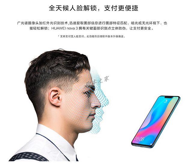 其它方面,华为Nova3i支持3D人脸识别,相比普通的2D人脸识别技术,安全性更高,同时识别率更好。比如,华为Nova3支持全天候人脸解锁,还支持支付宝刷脸支付等。此外,还支持3D Qmoji AR动态表情,带来更多的趣味性。