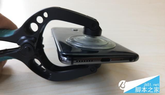 第二步:首先使用手机拆机专用加热装置,对魅族16玻璃后盖四周均匀加热,软件胶粘(没有专业拆机加热装置,也可以使用吹风机替代)。然后使用吸盘吸住手机靠近USB端的正反两面,使电池盖和手机出现缝隙,如下图所示。