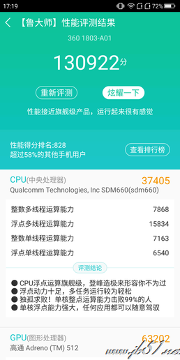 在鲁大师综合性能测试中,360手机N7 Lite的表现同样突出,跑出了130922分的好成绩。鲁大师的评价是“性能接近旗舰级产品,运行起来很有感觉”,这无疑是对360手机N7 Lite性能表现的最好肯定。