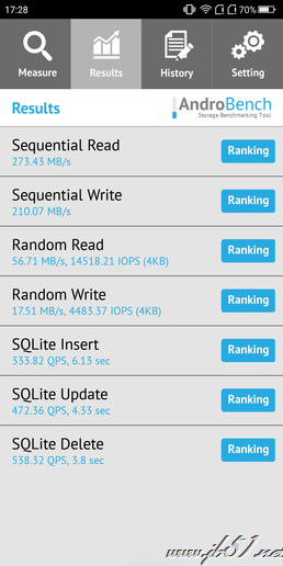 除了处理器外,存储芯片的读写速度也影响着手机的基础体验。360手机N7 Lite的AndroBench 5跑分究竟表现如何?实测中360手机N7 Lite顺序读取速度为273.43MB/s,顺序写入速度为210.07MB/s,与大多数同价位手机保持了持平的水准,读写速度与OPPO R15、vivo X21相当。