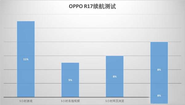 通过测试,oppor17的续航表现相当优秀,4小时的连续使用过后,还能剩下70%的电量,续航表现很不错,连续8小时的使用都会毫无压力的。