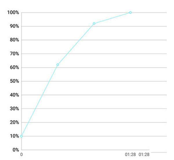 VOOC闪充是OPPO手机的最招牌功能,其最高能够提供5V/4A的大电流快充。在我们的实际测试中,OPPO R17从10%的电量充满到100%的满电状态,总共耗时1小时28分钟,其中前30分钟的充电速度尤为迅速,能够从10%充到62%,这是一个足够保证手机长时间使用的安全电量了。
