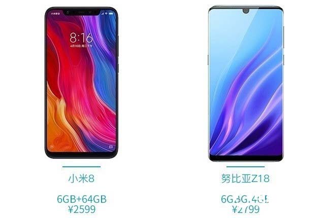 以同为 6 + 64GB 版本为例,小米8相当于比努比亚Z18便宜200元,有小幅的价格优势。