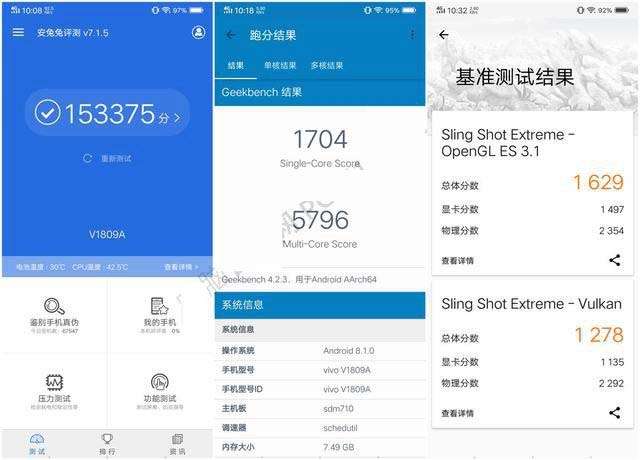 跑个分吧,以下是vivo X23安兔兔、Geekbench、 3DMark跑分成绩,如下图所示。