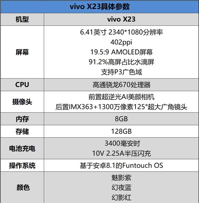 笔者所拿到的这款vivo X23是魅影紫色8+128GB的版本。