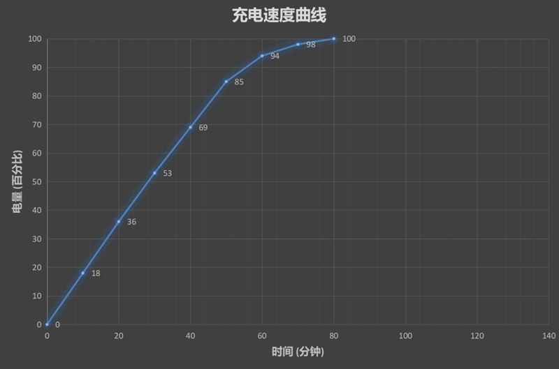 vivo X23标配一个10V2.25A快充头,从0%开始开机息屏充电,总计耗时80分钟充满。