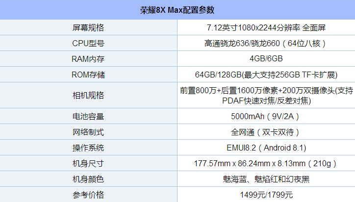 从配置上看,荣耀8X Max分为骁龙636和骁龙660两个版本,定价1499元起,性价比还是很不错的,从配置上看这款巨屏手机,会给小米MAX3造成比较大的压力,可以是同价位巨屏手机中,最大的竞争对手吧。