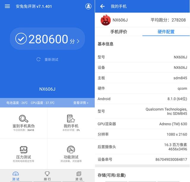 通过简单的跑分不难看出,努比亚Z18安兔兔跑分达到了18万分,完全符合高通骁龙845的理想性能,可谓发挥应该有的理论性能,这点还是不错的。