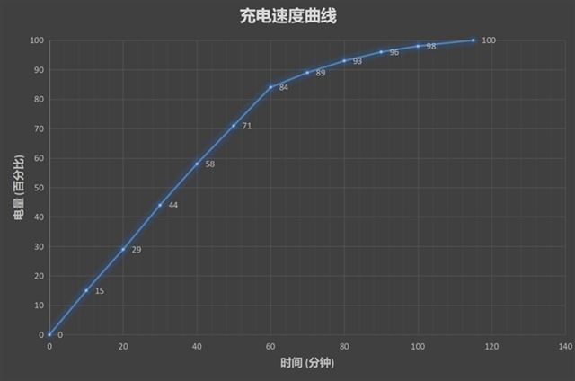 从0%开始充电,充满电花费了115分钟,考虑电池容量相对较大,所以这样的充电速度算是中规中矩,不算太优秀也不算那么落后。