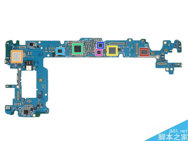 到了主板介绍环节,下图中红色方框内为高通骁龙845以及三星6GB LPDDR4X内存;橙色方框内为三星KLUDG4U1EA-B0C1 128GB eUFS存储;黄色方框内为恩智浦80T17 NFC控制器;绿色方框内为Skyworks SKY78160-51 WLAN前端模块;青色方框内为Avago / Broadcom AFEM-9096 LTE前端模块;蓝色方框内为高通WCD9341音频编解码器;紫色方框内为Maxim MAX77705 PMIC。