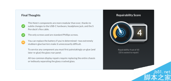 最终ifixit给三星Note9的修复性评分为4分(满分10分,分数越高越容易维修)。