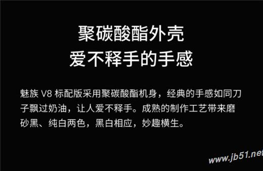 标配版魅族V8采用聚碳酸酯机身,拥有成熟的制作工艺,带来经典的手感,拥有磨砂黑和纯白两种配色。