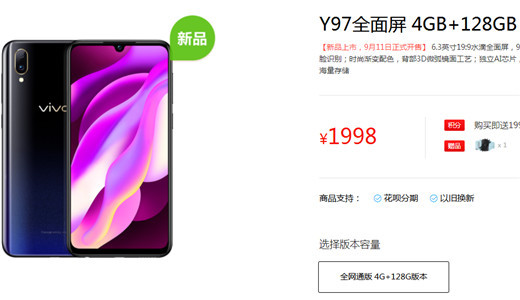vivoy97只有4GB+128GB版本可选,售价1998元;