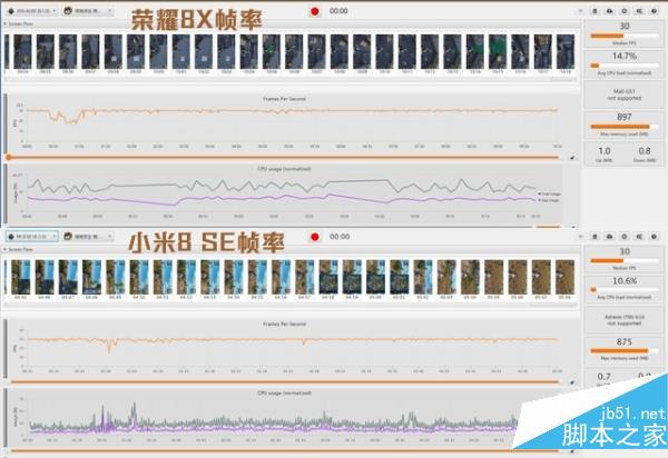 而在《荒野行动》游戏的对比中,荣耀8X表现平稳,帧率稳定在50-60fps之间,驾车长距离奔袭也不卡顿。小米8 SE的表现则有些差强人意,最高画质帧率下,帧率在25-60fps之间上下波动,画面偶尔出现卡顿,掉帧的情况也时有发生。