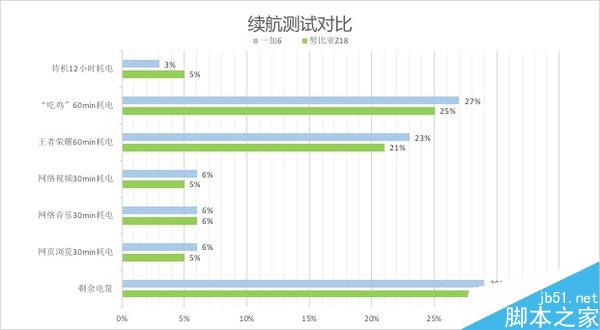 续航能力方面,在4+12小时的续航测试后,努比亚Z18和一加6分别剩余33%和29%的电量,主要差距体现在游戏的优化,待机12小时和游戏更多,但实际差距并不大。