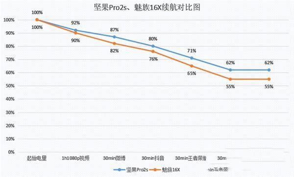 从上图可以看出,测试结果也印证了坚果Pro2s续航比魅族16X强一些。