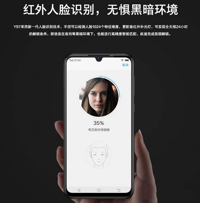 在解锁方案上,vivo Y97采用了红外人脸识别方案,与普通2D面部识别不同的是,红外人脸识别对于光线几乎无要求,即使是在夜间解锁,也无需任何灯光弥补,增加其功能适用场景。有趣的是,配合抬手亮屏功能,在用户看见vivo Y97的瞬间,它就完成了识别解锁,使用很方便。