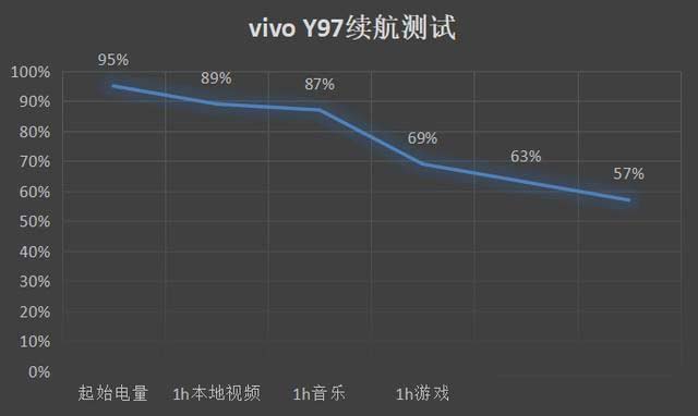 续航方面,vivo Y97内置3315mAh容量电池,对于6.3英寸手机而言,容量适中。不过得益于CPU功耗较低,通过5小时使用测试之后,该机剩余电量依然在50%出头,中度使用一天的续航是完全没有问题的。