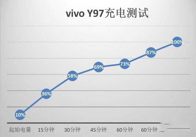 比较遗憾的是,vivo Y97作为Y系列千元机,相比X23依然阉割了快充支持,配备的是5V/2A充电器不支持快充。电量从0%充到100%,需要超过1个半小时,充电速度在同价位国产手机中,算是比较慢了。