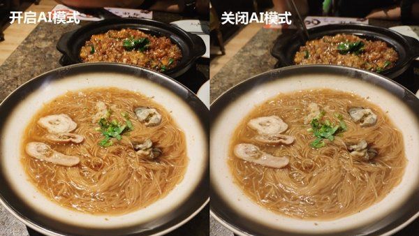 从上图的样张对比图中能看到,开启AI模式之后,食物所呈现出的效果更加诱人,照片中的色彩饱和度更高。