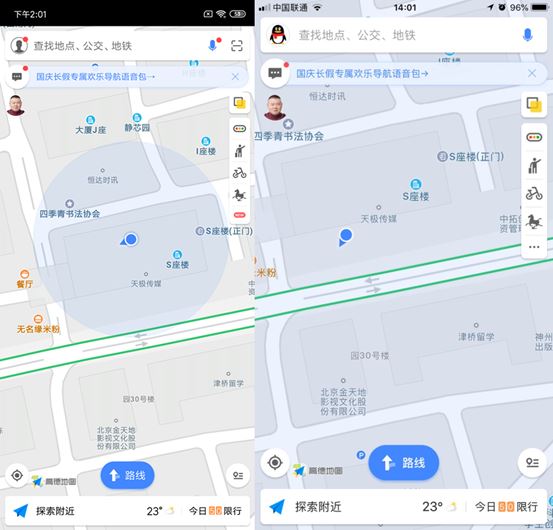 在同一地点打开小米8和iPhone 8 Plus里的高德地图,显示当前定位,放大之后发现两者的定位地点还是有差距的(左图为小米8,右图为iPhone)。实际上,天妹所在的位置和小米8显示的位置一样,误差目测不超过1米。所以从这点上来说,我还是很佩服小米8的定位功能,路痴朋友们可以不用担心了。