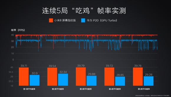 此前小米官方曾宣布小米8屏幕指纹版搭载骁龙845 AIE处理器,与Unreal Engine虚幻引擎深度合作,优化游戏性能。根据发布会上公布的数据,小米8 屏幕指纹版与华为P20 同时连续5局“吃鸡”帧率实测,小米8 屏幕指纹版的平均帧率每一局都高于华为。