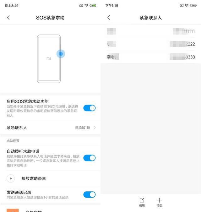 在最新的MIUI 10系统中,小米也终于加入了SOS紧急求助功能,在紧急情况下,可以连续按5次电源键,系统将会发送设置好的求助信息至紧急联系人,包括播放求助录音、以及发送通话记录等内容,解决了以往系统没有紧急求助功能的短板。