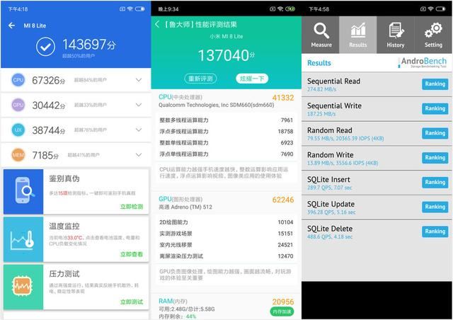性能方面,小米8青春版搭载的是高通骁龙660 AIE八核处理器,基于14nm工艺制程,定位中端。相比小米8 SE搭载的骁龙710(10nm)规格要低一个档次。从安兔兔V7跑分软件测试来看,小米8青春版安兔兔跑分大约在14万分左右,符合骁龙660跑分水准。