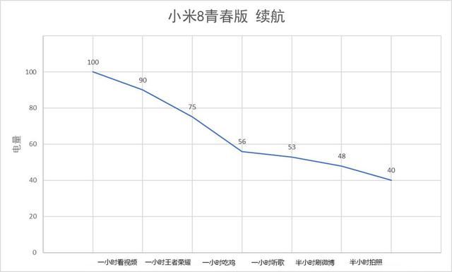 从5小时的重度使用测试来看,小米8青春版耗电60%,剩余电量为40%,而目前主流机型,5小时重度使用,可以剩余50%左右的点亮。因此,该机续航表现属于安卓机中偏中等略偏下水平,中度用户一天左右的使用需求问题不大,重度用户,则比较难坚持一天。