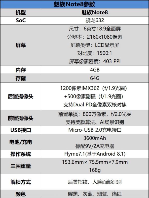 魅蓝Note6采用了索尼IMX362/三星2L7传感器,加上500万像素的副摄像头,组成了景深双摄方案,加上虹软的算法,让魅蓝Note6的拍照效果要比当时同价位手机出色不少。而魅族Note8上也采用了魅蓝Note6的双摄方案,经过一年多的调教以及高通骁龙632上的Spectra 160双混合ISP,让魅族Note8的拍照效果更进一步。