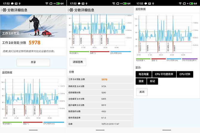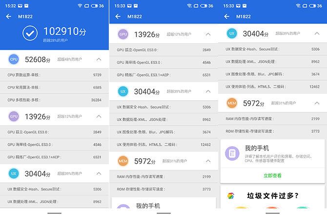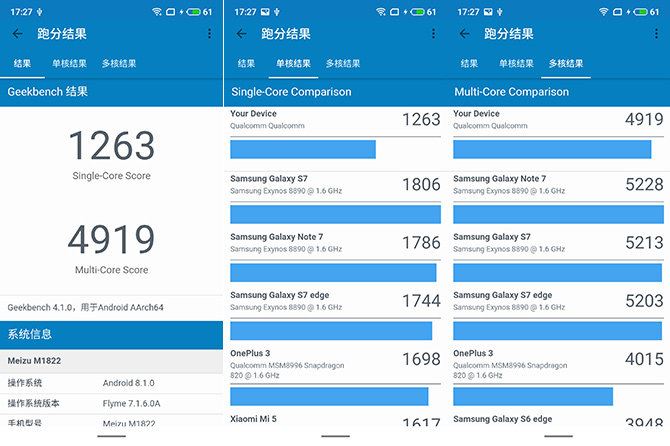 得益于骁龙632的出色性能表现,魅族Note8在安兔兔测试中能达到10万分的水平,对于一台中端手机来说性能还是相当不错,当然性能和骁龙660还是有一定的差距。另外,通过GeekBench可以看到骁龙632单核心能达到1263分,多核心得分4919分,这样的性能对于日常使用已经相当足够。另外,由于Flyme系统优化出色,让魅蓝Note8的PCmark能达到5978分,CPU的性能调度也是相当到位。3D性能方面,只能说骁龙632的表现中规中矩,实际性能还是要看游戏测试。