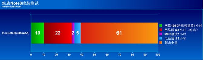 魅族Note8使用3600mAh电池,能提供足够的续航能力,我们也针对魅族Note8进行4小时的高强度续航测试,首先进行1个小时网络1080P视频播放,一个小时后消耗10%的电量,之后进行1个小时的游戏,消耗了22%电量,在进行1小时MP3播放,消耗了2%的电量,进行1小时通话测试,消耗了5%的电量,4小时总共消耗了39%的电量,剩余61%的电量。整体来说魅族Note8的续航表现让人满意,毕竟这样高强度的测试下还有61%的电量剩余,大电池加上省电的骁龙632处理器,还有Flyme7系统的深度优化带来了更省电效果,魅族Note8在中高强度下使用一天应该也不成为问题。