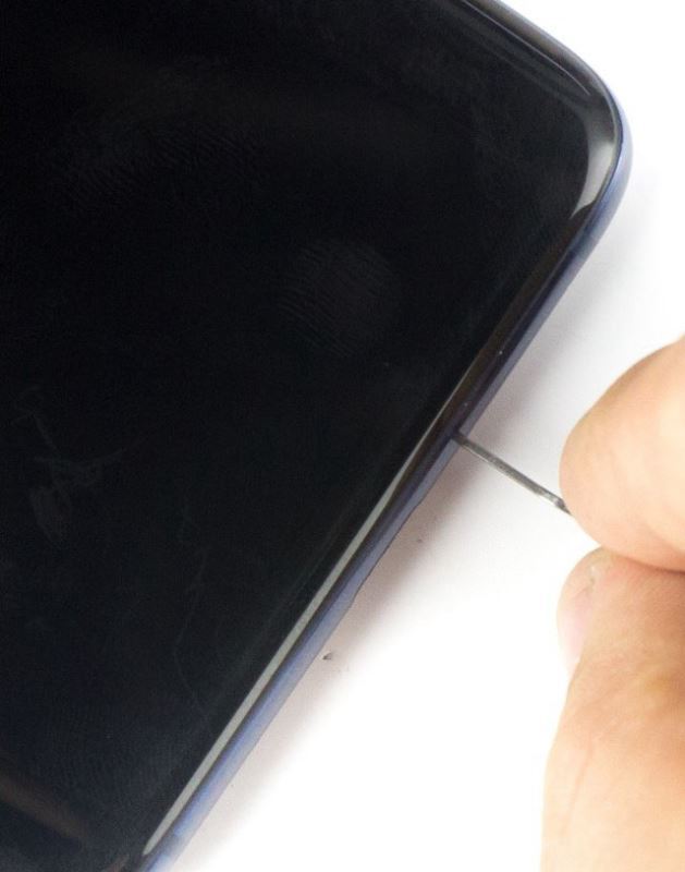 第一步:拆机前,首先长按电源键,将手机关机,然后使用卡针,将机身底部的SIM卡托取下,如下图;