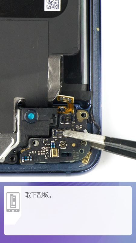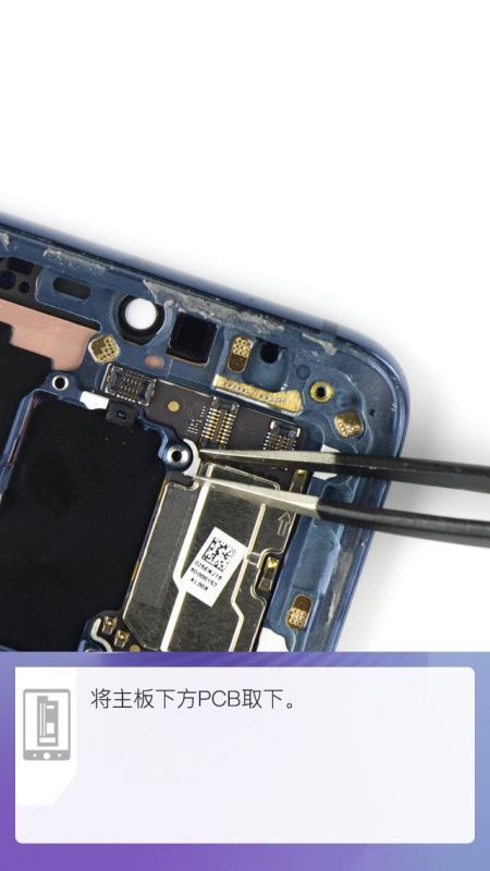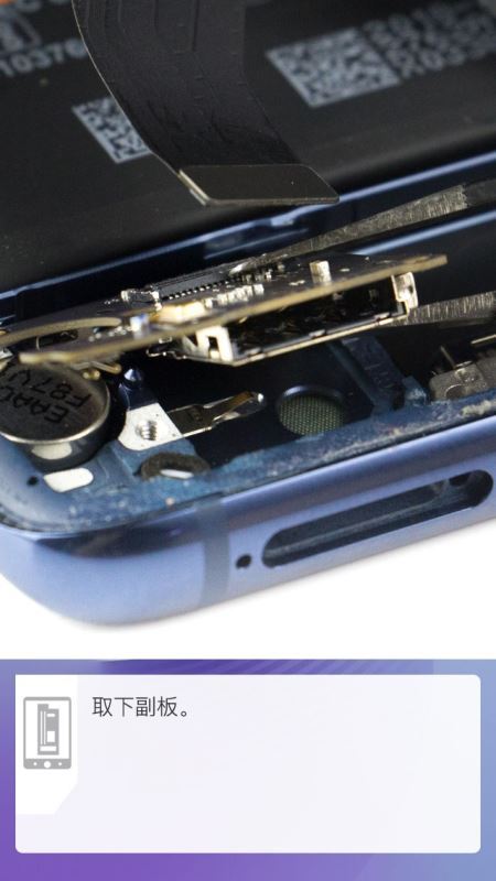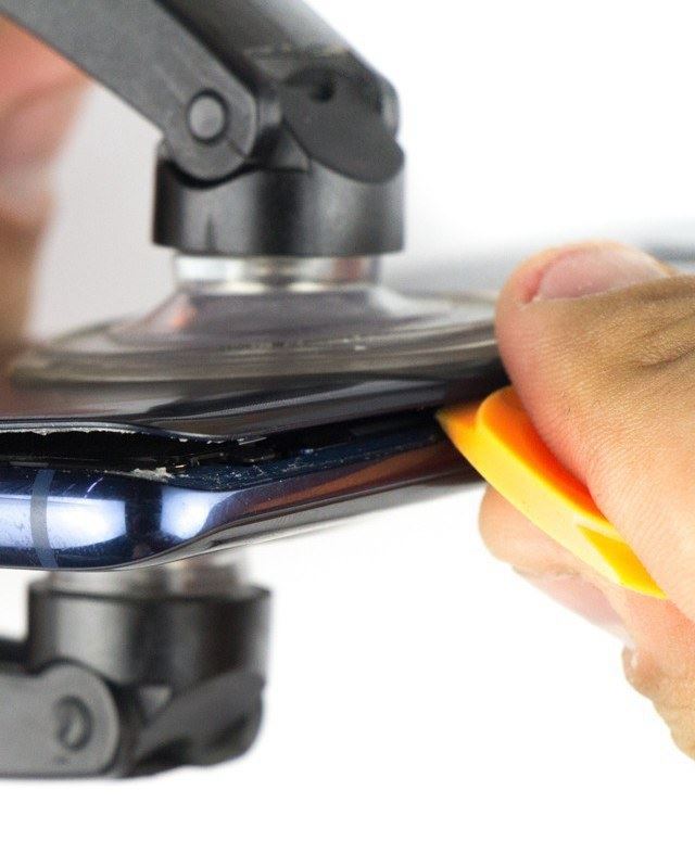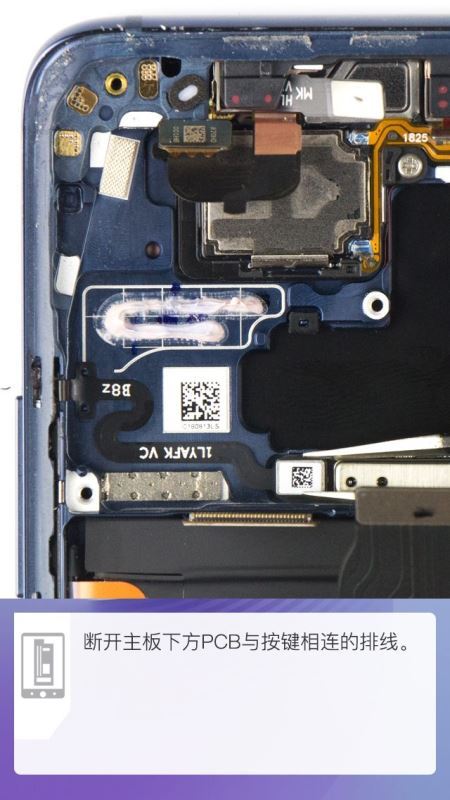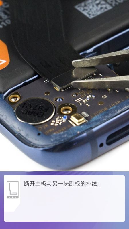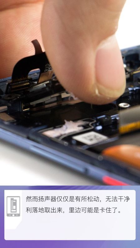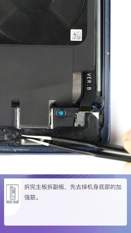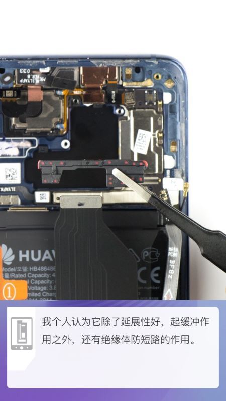 然后使用吸盘,吸出一条缝隙,再插入塑料薄卡片小心分离。由于这款手机支持无线充电,后盖区域会有无线充电感应排线,因此卡片不要插太深。