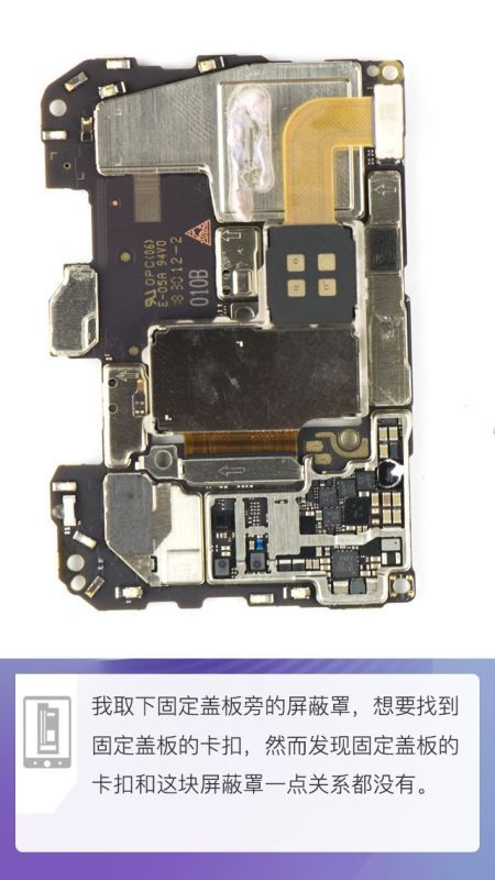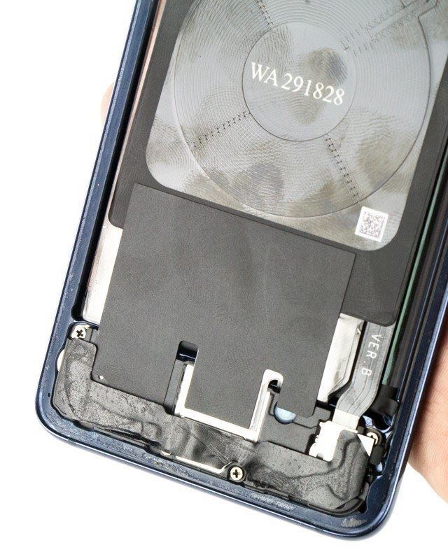 华为Mate20 Pro机身为三段式结构,电池和副板被无线充电圈覆盖。