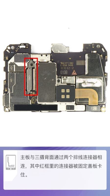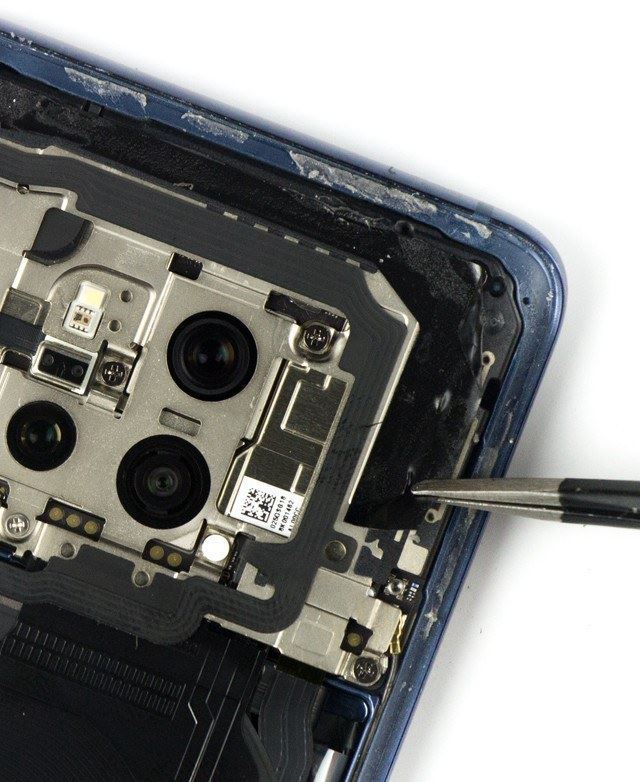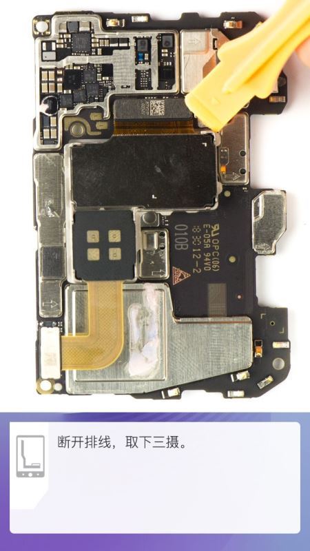 由于华为Mate20 Pro采用屏幕指纹设计,背壳没有指纹传感器,因此可以比较快的将后盖分离。可以看到,背壳边缘被一圈白色的胶保护的很到位,而在“起跑之眼”旁边也有泡棉用于缓冲。如下图所示。